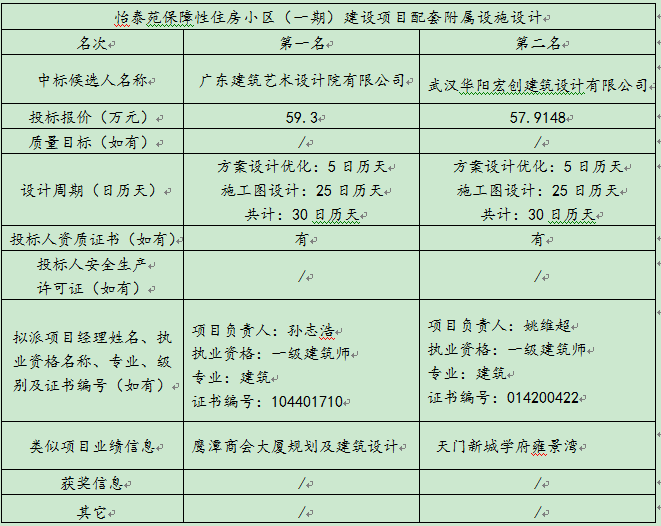 怡泰苑包管性住房小区(一期)建设项目配套隶属设施设计于 2015 年8月6日至2015年8月11日在恩施州公共资源生意中心 宣布招标通告,,,,, 2015年8月 31日在恩施州公共资源生意中心开标大厅(恩施市施州大道58号邮政局四楼)开标,,,,,并于 2015年 8月 31日完成评标事情。。凭证评标委员会提交的评标报告,,,,,恩施州州直包管性住房建设治理中心已经确认评标效果,,,,,现举行评标效果公示。。