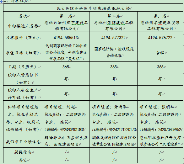民大医院全科医生临床作育基地大楼于 2015 年11月13日至2015 年11月18日在恩施州公共资源生意中心 宣布招标通告,,2016年1月 5日在恩施州公共资源生意中心开标大厅(恩施市施州大道58号邮政局四楼)开标,,并于 2016年 1月 5日完成评标事情。。。凭证评标委员会提交的评标报告,,湖北民族学院隶属民大医院已经确认评标效果,,现举行评标效果公示。。。